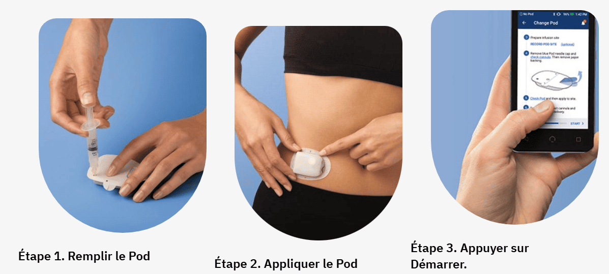 - Le Pod : un petit réservoir d’insuline étanche que l’on colle directement sur la peau, remplaçable tous les 3 jours.